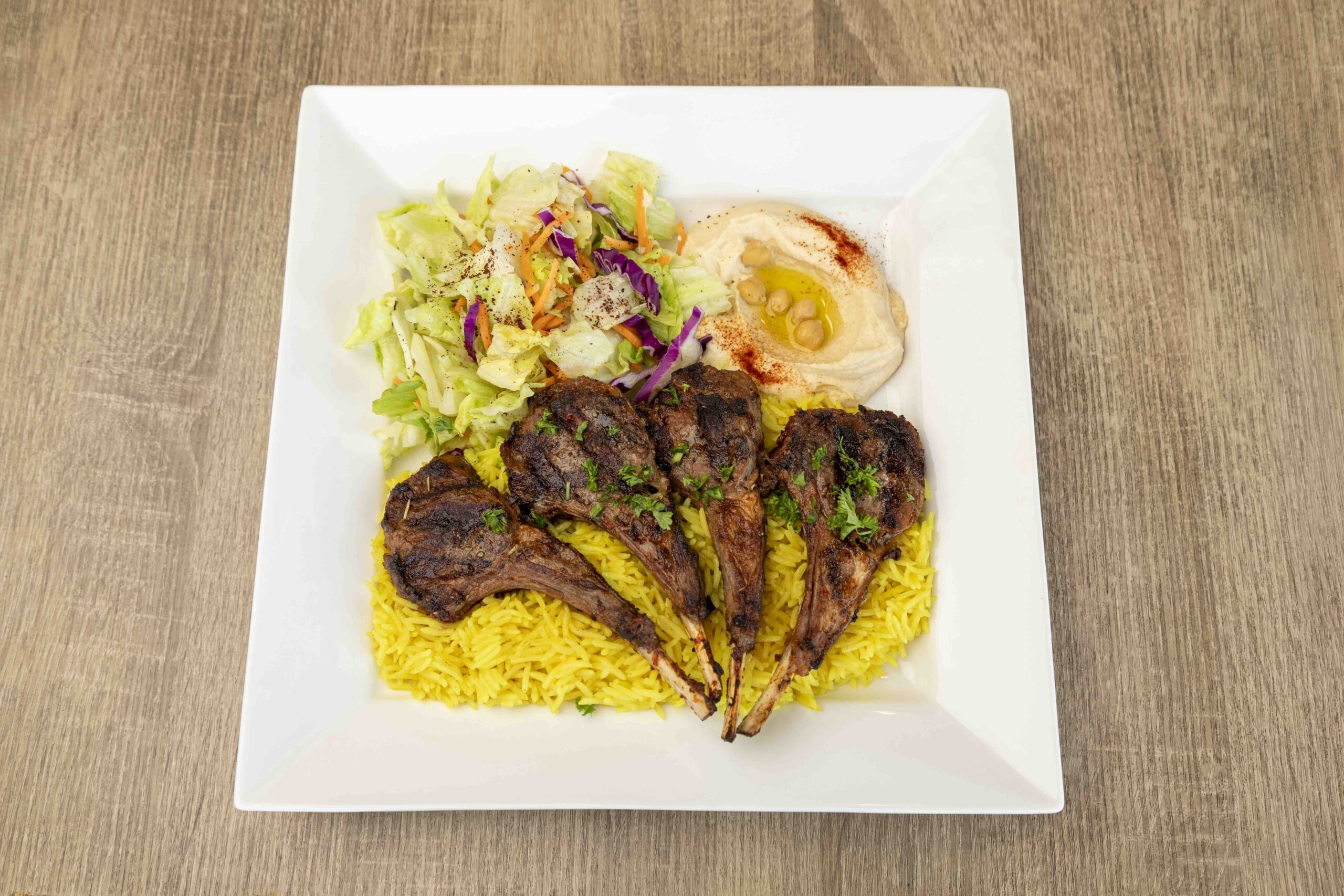 Four pieces of lamb chops served with yellow rice, hummus and a side of green salad.